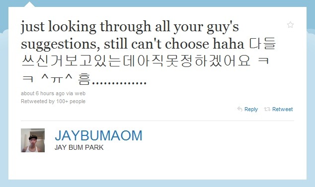 so i was online at 3am when jay tweeted and im thinkin what is he doing up so late. i think he was waiting up for the fans in korea since it was around 4pm over there. thinking of fanclub names make me go -_-? i don't know how jays going to read all of his tweets and pick a name. lol, the cutie thought twitter would be easier than yt. g'luck jay! he has almost 40k follows O_O...and its only been 2 days.